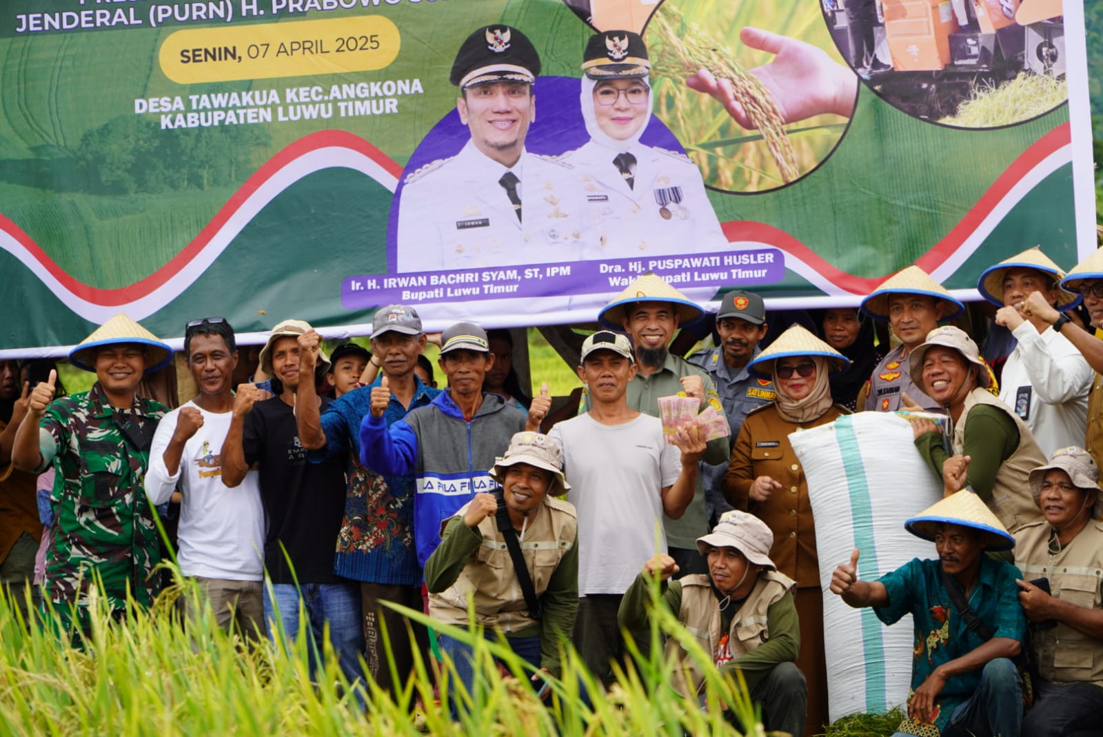 Lutim — Dandim 1403/Palopo, Letkol Armed Kabit Bintoro Priyambodo menghadiri kegiatan panen raya padi di Desa Tawakua, Kecamatan Angkona, Kabupaten Luwu Timur, Sulawesi Selatan, Senin 7 April 2025.
