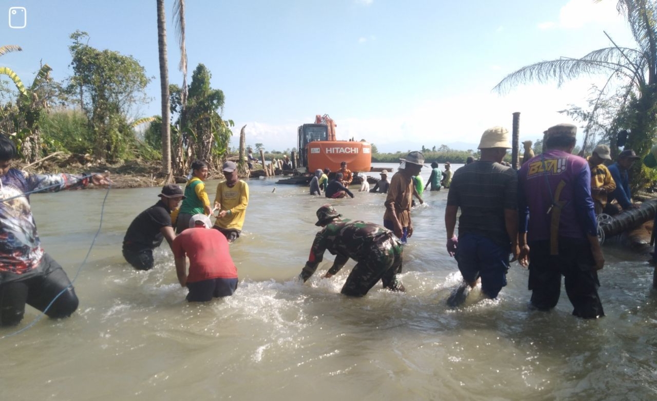 Serda Imam menjelaskan tanggul sementara dibangun menggunakan batang pohon kelapa dan bambu dengan mnggukan excapator dan diletakkan di titik-titik rawan guna meminimalisir kerusakan lebih lanjut.