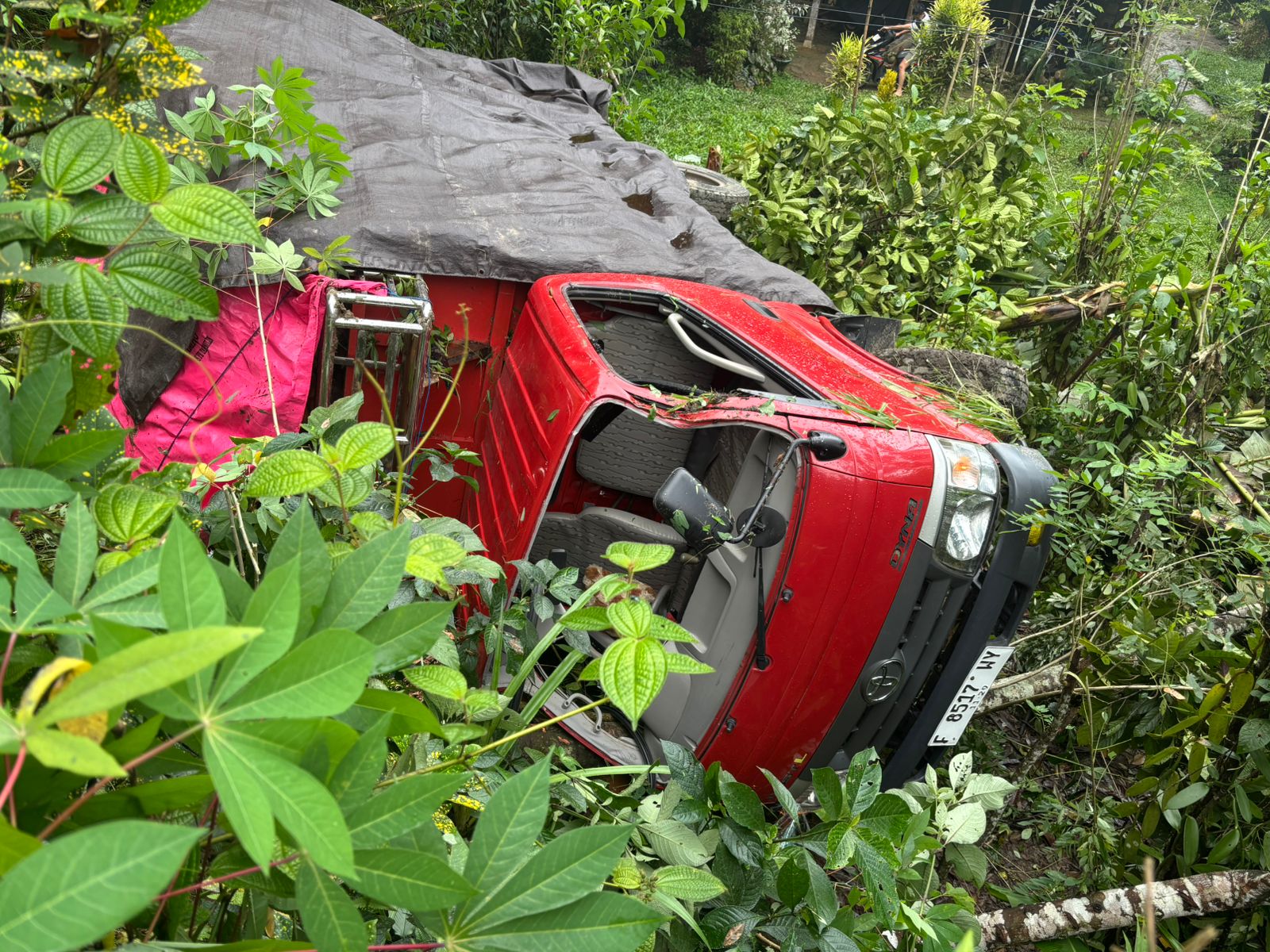 Sebuah kendaraan truk Toyota Dyna Host berwarna merah dengan nomor polisi F-8517-WY terguling setelah mencoba menghindari kendaraan dari arah berlawanan.