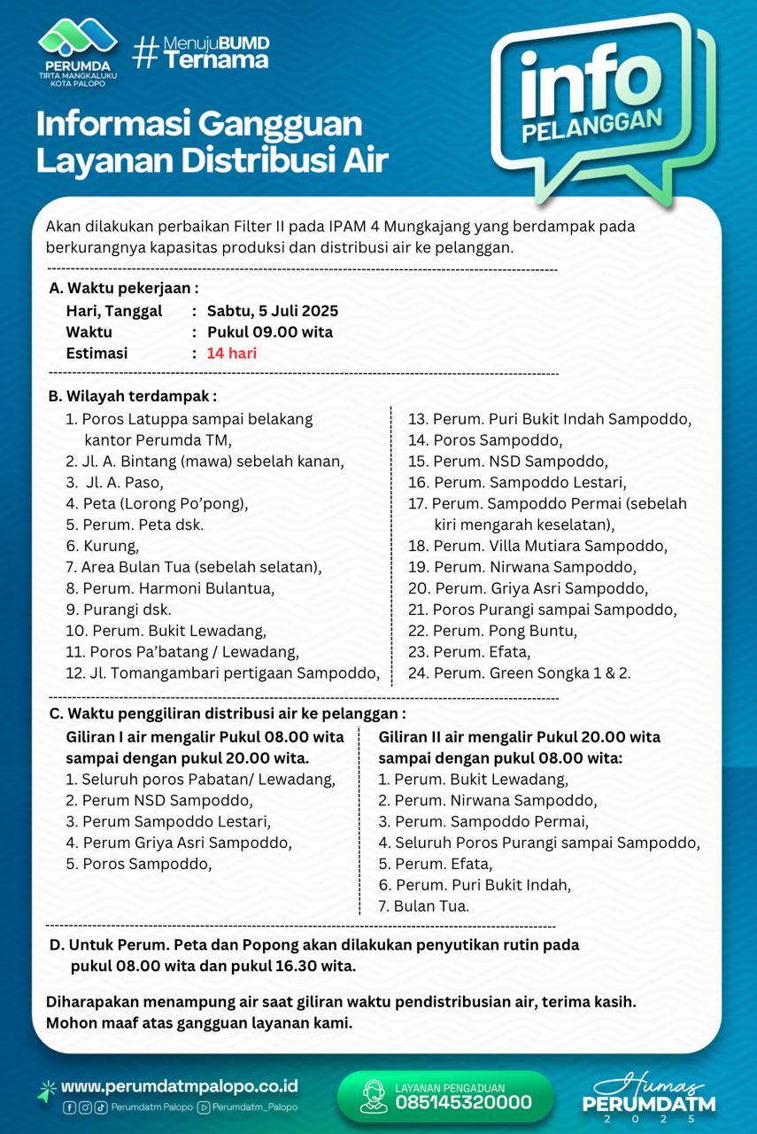 Beranda Berita Ini Wilayah yang Terdampak Gangguan Layanan Distribusi Air di Kota Palopo BeritaDaerahKota PalopoIni Wilayah yang Terdampak Gangguan Layanan Distribusi Air di Kota PalopoARZ0 min bacaJuli 4, 202540×Ini Wilayah yang Terdampak Gangguan Layanan Distribusi Air di Kota PalopoSebarkan artikel ini Post Views: 40 Pos TerkaitBeritaBangun Komunikasi yang Baik untuk Kemajuan Pendidikan, Ketua PGRI Luwu Utara Audens dengan Komisi I DPRD Luwu UtaraBeritaButuh 293 Tenaga Kerja Baru di Pabrik II RKEF, PT BMS di Luwu Buka Lowongan KerjaBeritaWali Kota Palopo Tinjau Jembatan Penghubung Kelurahan batu walenrang dan Kelurahan MancaniHukrimKasus Dugaan Penyerobotan dan Pengrusakan Kini Masuk Tahap 2, Tersangka dan BB Diserahkan ke JPUBeritaJelang Musda DPD II KNPI Luwu Utara, Ketua GMNI Muh. Ari Fahmi Usulkan Uji Kelayakan Figur BacalonBeritaPeringati Hut Partai Golkar Ke-61, DPD Golkar Luwu Utara Gelar Pasar Murah, Doa dan Zikir Bersama Serta Pemberian Santunan kepada Anak Yatim