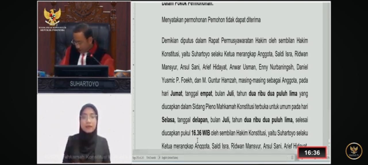 “Menyatakan permohonan Pemohon tidak dapat diterima,” kata Ketua MK Suhartoyo saat membacakan amar putusan dalam sidang yang disiarkan secara langsung melalui YouTube MK, Selasa (8/7/2025).