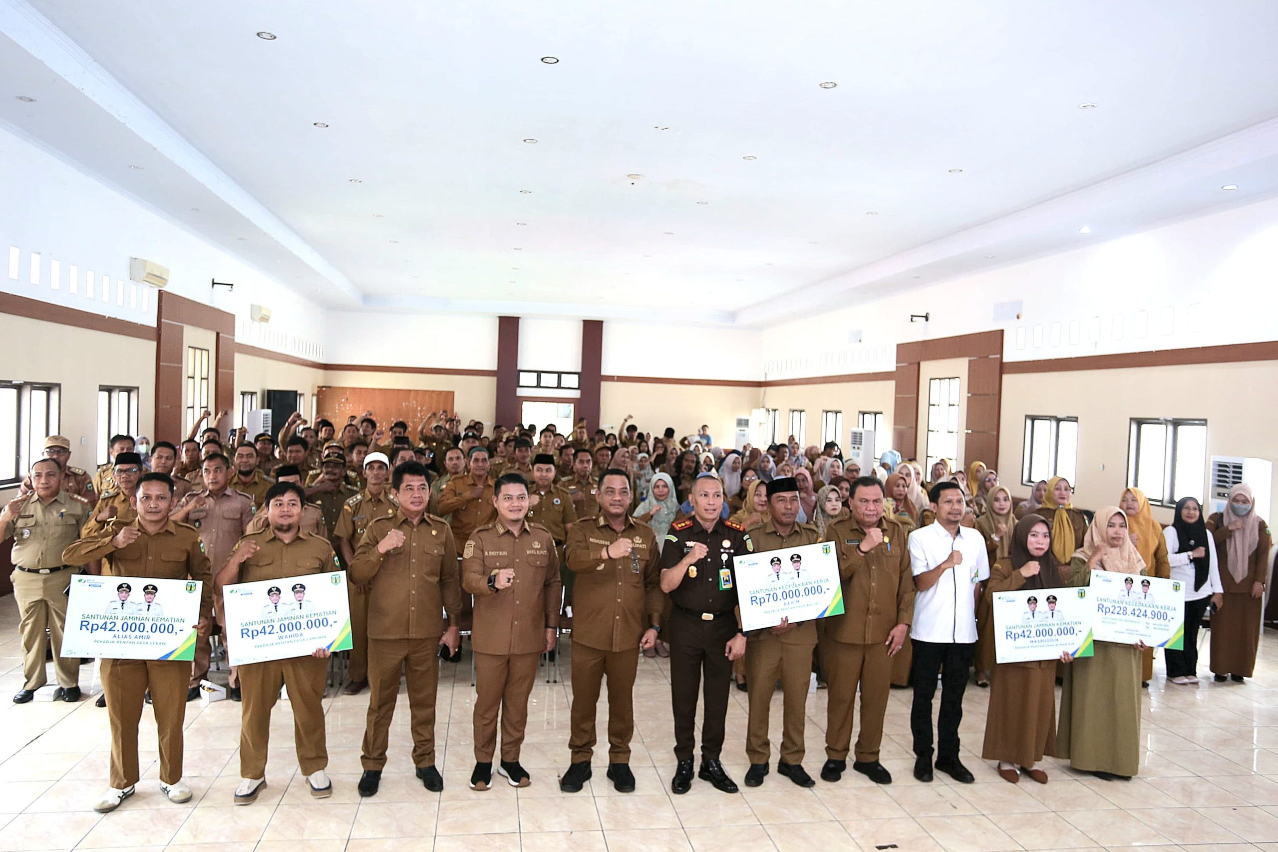 Pada kesempatan itu, Bupati Juga menyerahkan santunan kematian dan santunan kecelakaan kerja kepada ahli waris pekerja rentan dan aparat desa yang telah meninggal dunia.