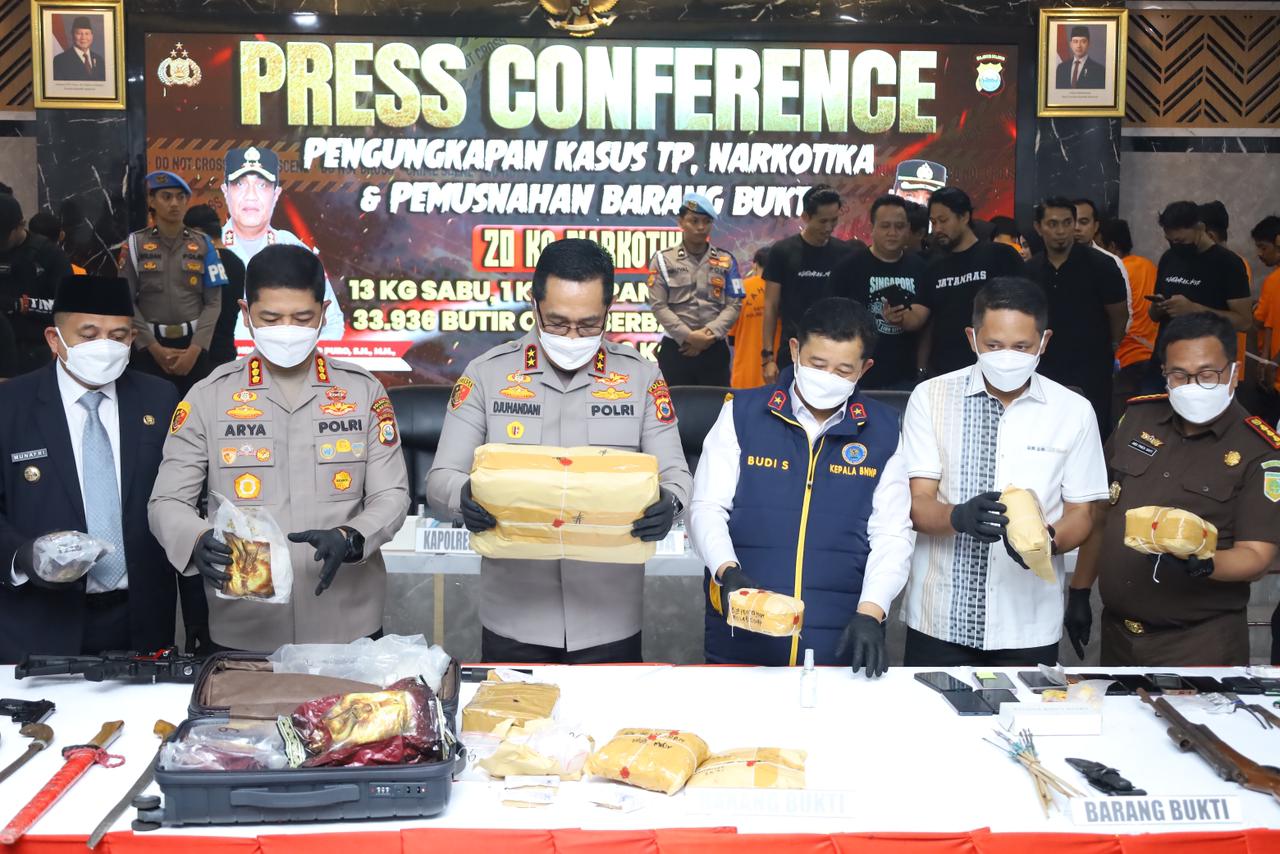Barang bukti yang dimusnahkan meliputi total 20 kilogram narkotika, terdiri dari: 13 kg sabu, 1 kg cairan sintetis, 6 kg atau 33.936 butir obat berbahaya (THD).
