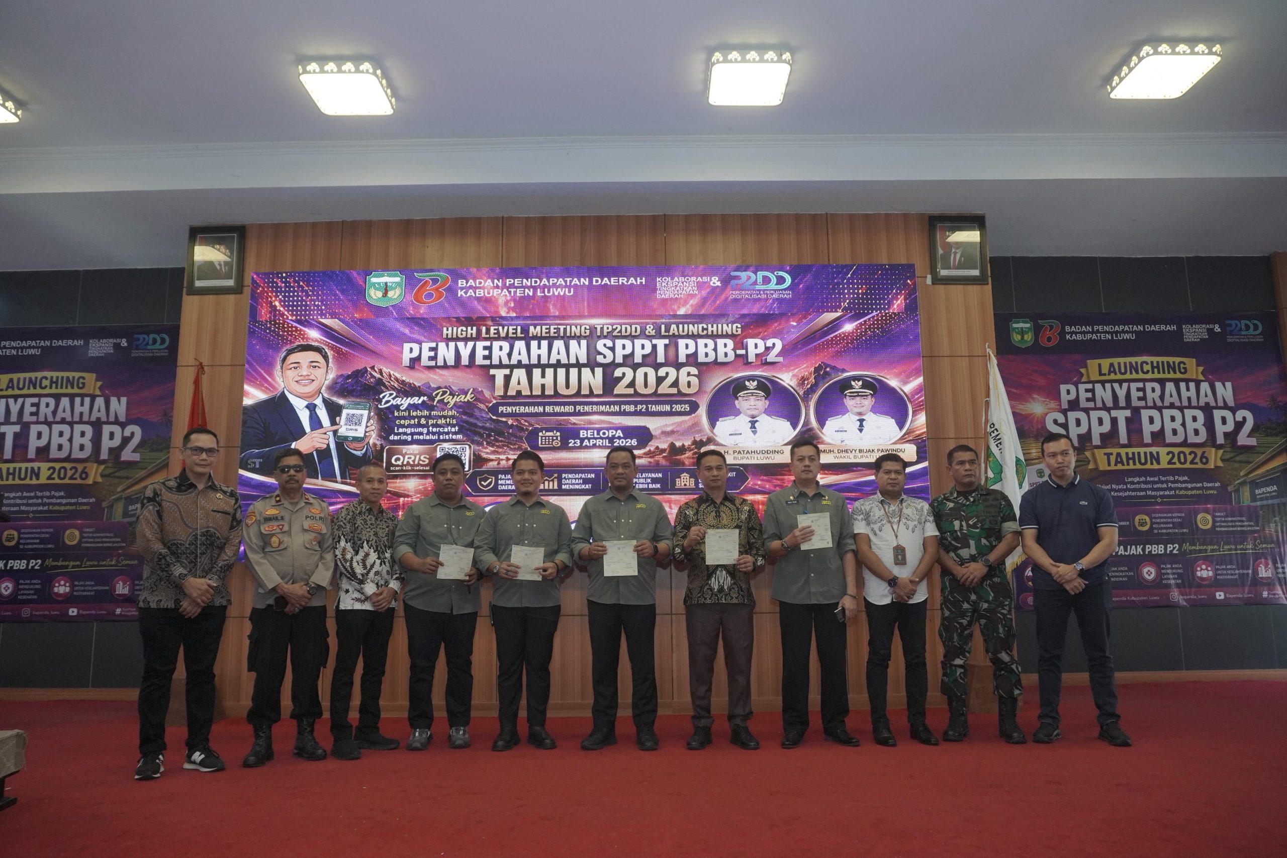 Luwu, NUSANTARA HEBAT.CO.ID — Bupati Luwu, Patahuddin menghadiri High Level Meeting Tim Percepatan dan Perluasan Digitalisasi Daerah (TP2DD) yang dirangkaikan dengan launching penyerahan SPPT PBB-P2 Tahun 2026 serta penyerahan reward penerimaan PBB-P2, Kamis (23/4/2026), di Aula Andi Kambo, Kompleks Perkantoran Bupati Luwu.