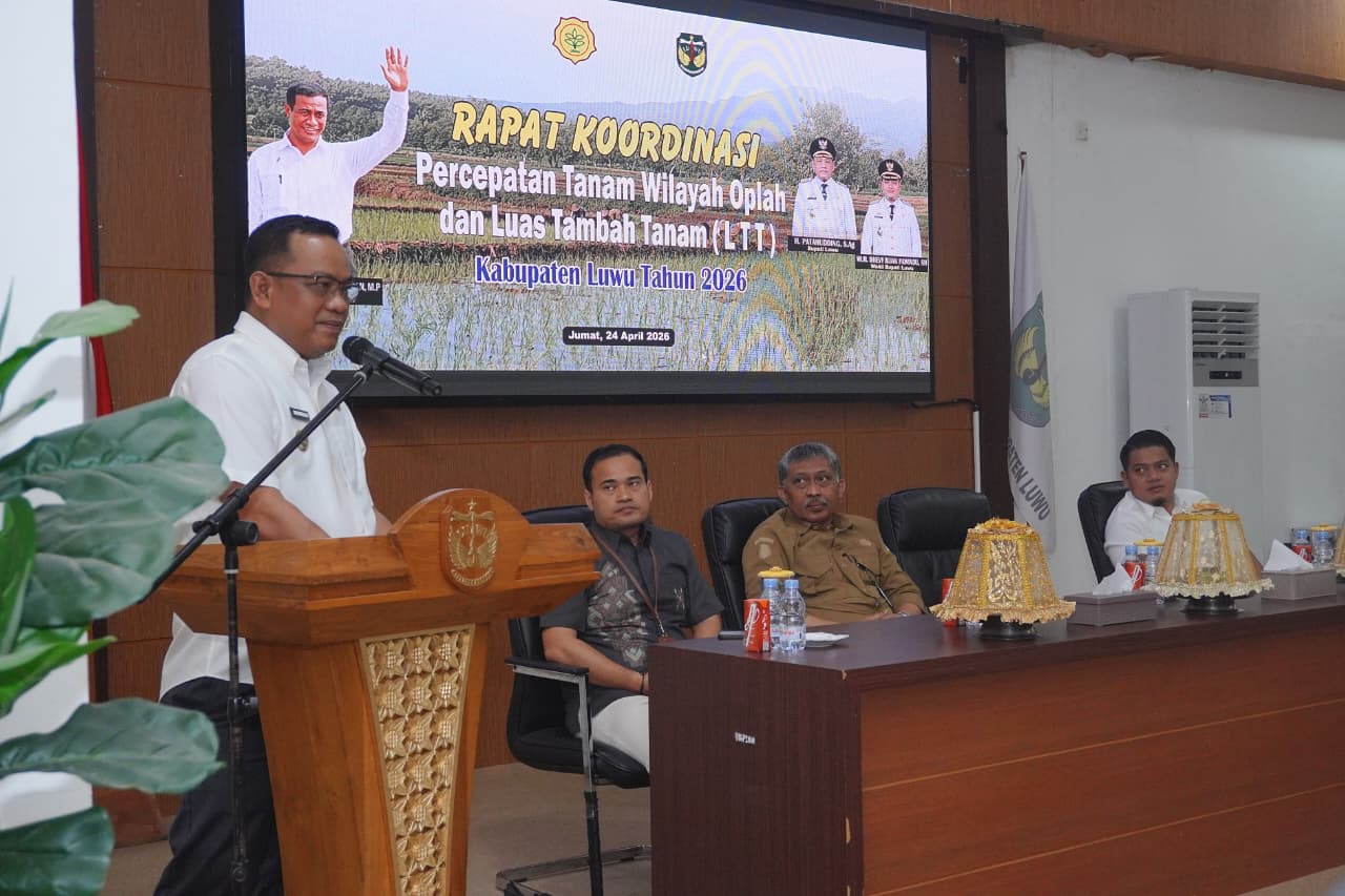 Luwu, NUSANTARA HEBAT.CO.ID — Bupati Luwu, Patahudding, menekankan pentingnya penguatan peran penyuluh saat Rapat Koordinasi Percepatan Tanam Wilayah Optimalisasi Lahan (Oplah) dan Luas Tambah Tanam (LTT) di Aula Rumah Jabatan Bupati Luwu, Jumat (24/4/2026).
