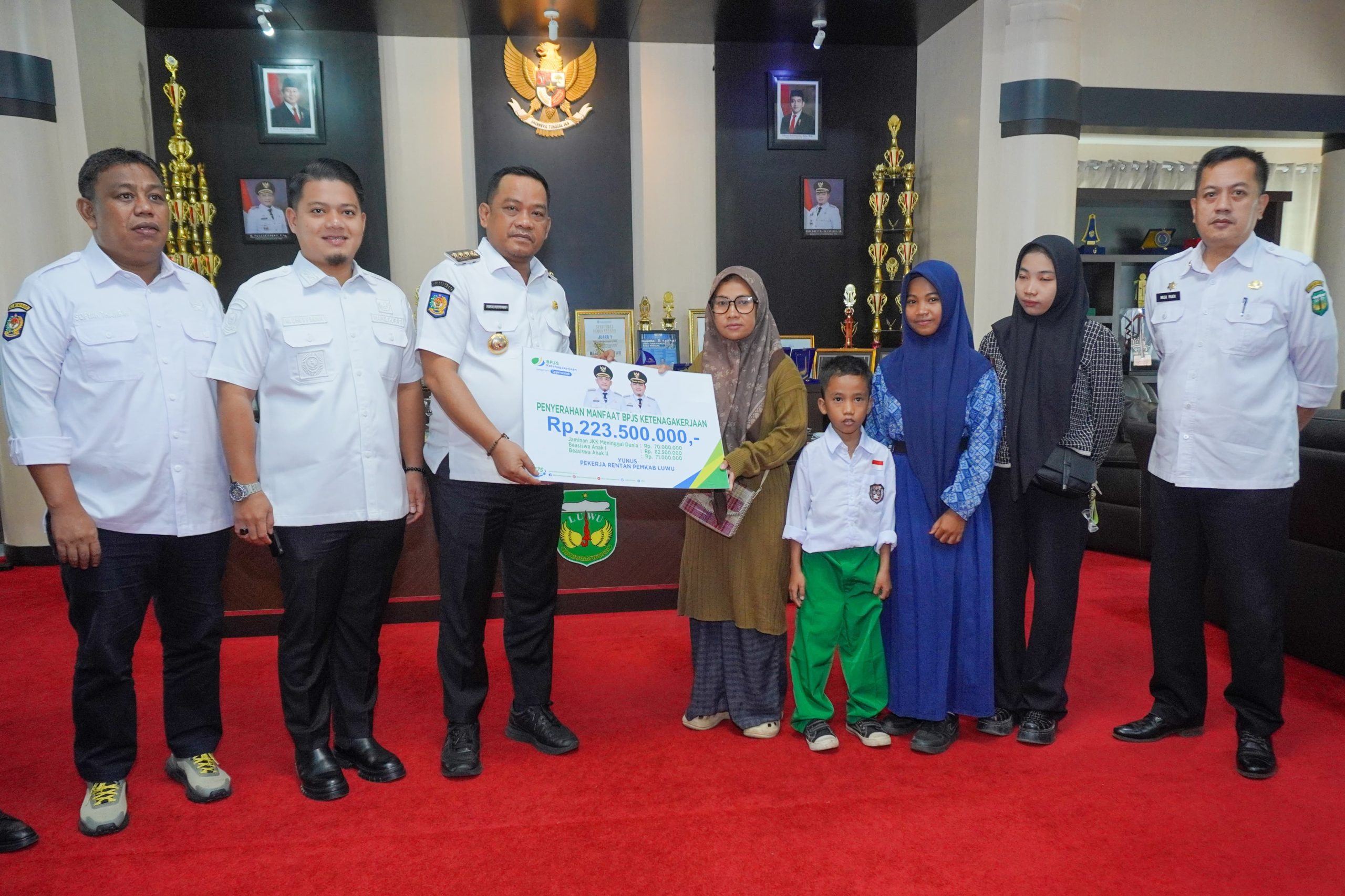 Luwu, NUSANTARA HEBAT.CO.ID –– Bupati Luwu, Patahudding, menyerahkan santunan kecelakaan kerja kepada keluarga almarhum Yunus di ruang kerja Bupati Luwu, Rabu (22/4/2026). Total santunan yang diberikan mencapai Rp223.500.000 yang terdiri dari santunan kematian serta beasiswa bagi anak almarhum.